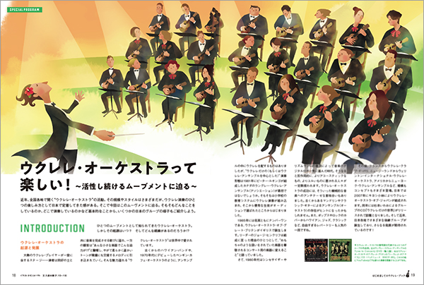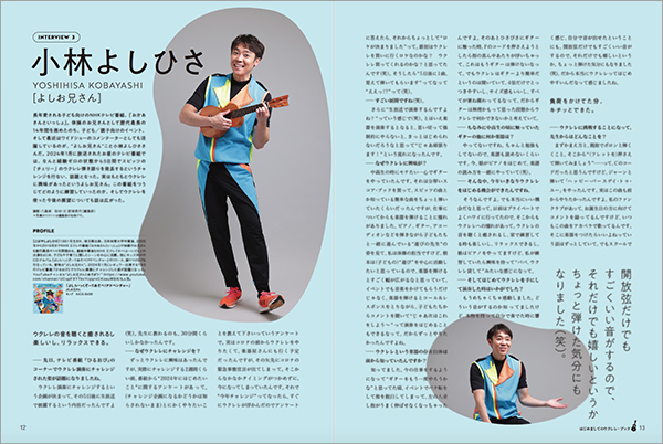 『はじめましてのウクレレ・ブック』とは、夏と冬、年2回刊行している『ウクレレ・マガジン』よりももっとビギナーに特化した年1回刊行ムック。ウクレレ・アーティストのみならず、ライトにウクレレを楽しむ著名人のインタビューや、ハードウェア情報、楽譜などのウクレレ情報をお届けしています。今回は、近年楽器を手にしたばかりのフリーアナウンサー、住吉美紀さんや体操のお兄さんとして現在も活躍している“よしお兄さん”こと小林よしひささんがインタビューに登場。ウクレレを手にして新たに見えた目標などを伺いました。他にも“ウクレレ・オーケストラ”に迫るなど、ウクレレのさまざまな魅力を紹介しています。