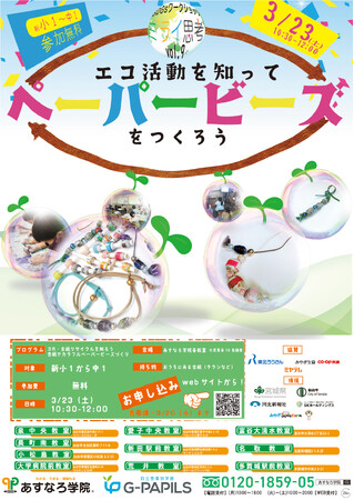 株式会社 学研ホールディングス(東京・品川/代表取締役社長:宮原博昭)のグループ会社、株式会社 学研スタディエ(さいたま市/代表取締役社長:亀谷眞宏)の展開する、宮城県の総合進学塾 あすなろ学院では、令和6年3月23日(土)、SDGsワークショップ「ミライ思考」の第9弾を開催します。今回のテーマは「身近なエコ活動について考えること」「エコ活動の一つであるペーパービーズ作りを楽しく実践すること」です。