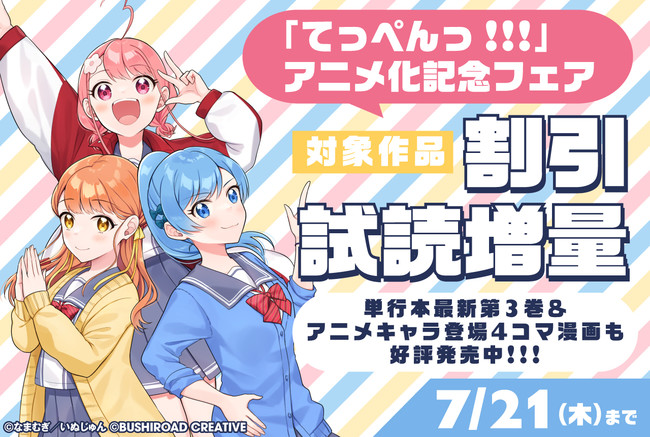 株式会社ブシロード(本社:東京都中野区、代表取締役社長:木谷高明)のグループ会社にあたる株式会社ブシロードクリエイティブ(本社:東京都中野区、代表取締役社長:成田耕祐)は、本日7月8日(金)より『「てっぺんっ!!!」アニメ化記念フェア』を開始することをご案内致します。「月刊ブシロード」にて連載中の漫画「てっぺんっ!!!」を原案としたオリジナルTVアニメ「てっぺんっ!!!!!!!!!!!!!!!」が2022年7月2日(土)よりTOKYO MXほかにて放送開始いたしました。また、漫画「てっぺんっ!!!」の第3巻が本日発売となります。これらを記念して関連電子書籍の割引販売、試読増量等を行います。さらに、ブシロードの公式WEBコミックサイト「コミックブシロードWEB」でも、いつもより多くの話数が無料で読める施策を行います。ぜひこの機会に「てっぺんっ!!!」をお読みいただき、お買い求めください。