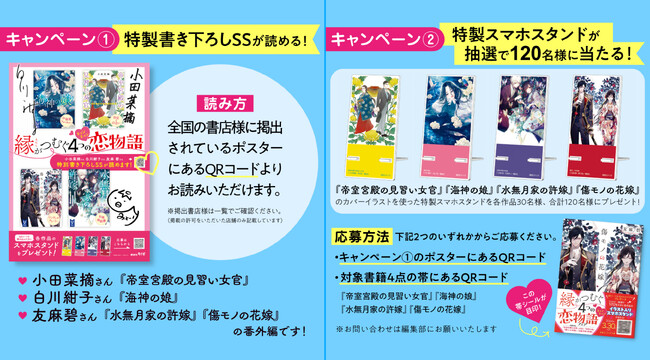 「帝室宮殿の見習い女官」「海神の娘」「水無月家の許嫁」「傷モノの花嫁」のカバーイラストを使った特製スマホスタンドを各作品30名様、合計120名様にプレゼント!