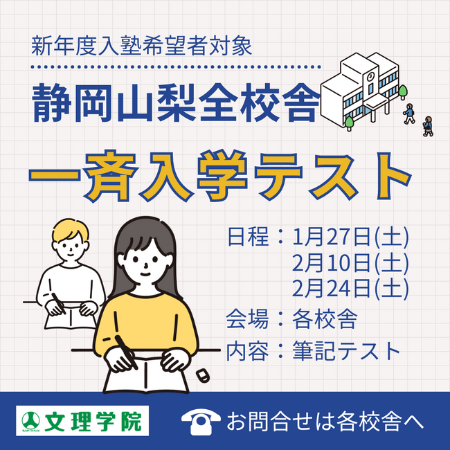 株式会社 学研ホールディングス(東京・品川/代表取締役社長:宮原博昭)のグループ会社、株式会社文理学院(山梨・都留/代表取締役社長:小倉勤)は、1月27日(土)、2月10日(土)、2月24日(土)に「全校舎一斉入学テスト」を実施します。対象は、小学生・中学生となります。
