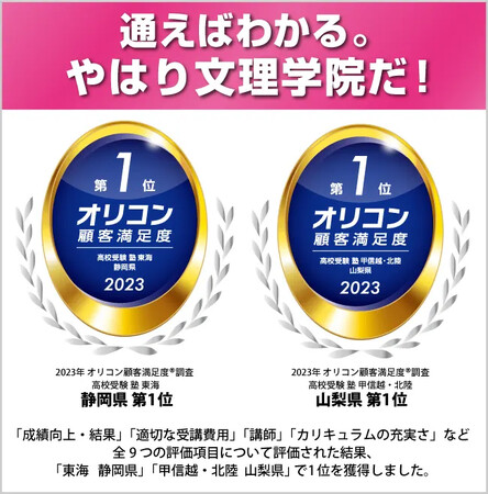 文理学院は「2023年 オリコン顧客満足度(R)ランキング 高校受験 塾 東海 静岡県/甲信越・北陸 山梨県」において、山梨県では5年連続の1位、静岡県では3度目(2018年、2019年、2023年)の1位となりました。