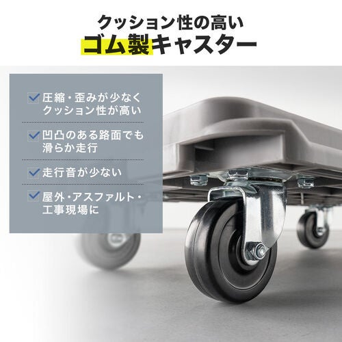 クッション性の高いゴム製キャスターを採用しており、従来のナイロン製に比べて走行音が静かです。床の小さな段差や点字ブロックなどの凹凸もスムーズに乗り越えられるため、音を気にする夜間の作業や、マンションの廊下、オフィス内での運搬に最適です。