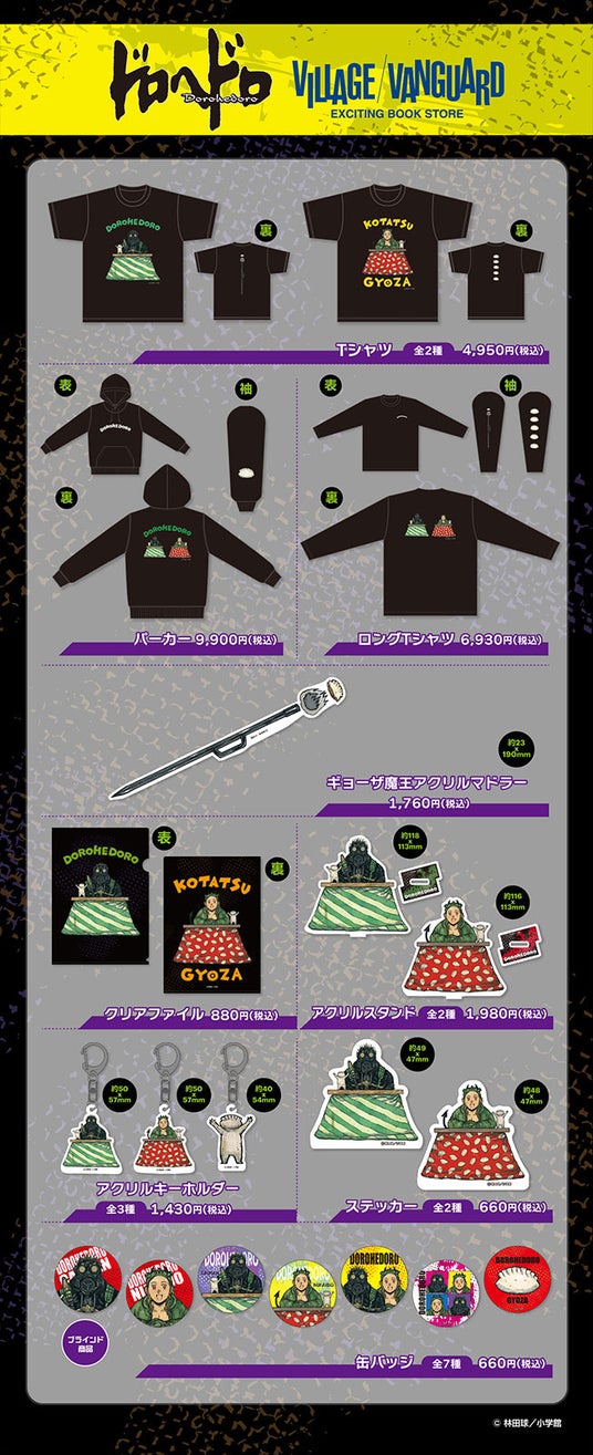 寒い季節にぴったりな、コタツでぬくぬくしている『カイマン』『ニカイドウ』『ギョーザ男』の、細部まで楽しめるイラストに注目!「Tシャツ」は先生が描いてくださったデザインをそのままグッズ化!!背中のギョーザや、ギョーザ魔王の杖がポイントです。中でもオススメはギョーザ魔王の杖を再現した「アクリルマドラー」!!ギョウザとハイボールで一杯やる時とかに是非!
