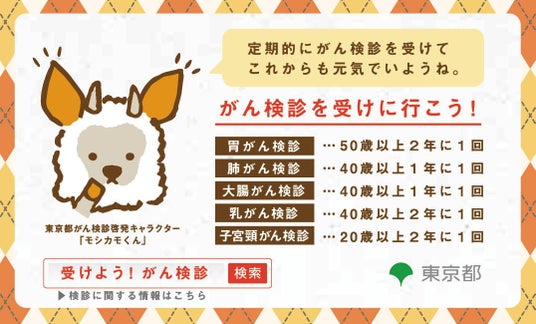 がんの早期発見のため、東京都がん検診啓発キャラクター「モシカモくん」のイラストで、がん検診受診を呼びかけるメッセージカード及びアニメーション付きメッセージ画像を作成しました。ぜひご利用ください!