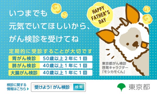 東京都では、がん予防・がん検診受診率向上のため、6月15日の父の日にあわせ、がん検診の大切さを伝える「父の日キャンペーン」を実施します。いつまでも元気でいてほしいお父さんにメッセージカードを贈り、がん検診の大切さについて一緒に考えてみませんか。