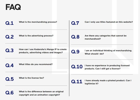 「FAQ」では、11のよくある質問とその回答を掲載。マンガIP活用のフローやおすすめ作品、ライセンス手数料、個人でのライセンスの使用可否など、さまざまな疑問にお答えしています。