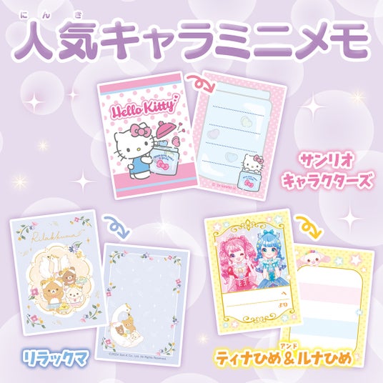 切り取って使える人気キャラのミニメモ。ハローキティ、マイメロディ、シナモロールのメモが1枚ずつ、リラックマのメモが3枚、ティナひめ&ルナひめのメモが3枚の合計9枚です。