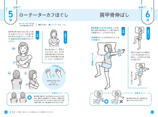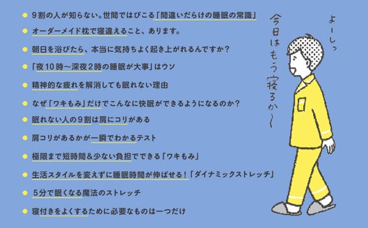 実は、睡眠には「最適な疲れ」というものが存在します。全く疲れていなければ眠りにつくのは困難ですが、疲れすぎても中途覚醒(途中で目が覚めてしまうこと)が多く、質の悪い睡眠になってしまうのです。本書では、快眠するための「程よい疲れ」を生み出すストレッチを行った後、眠るためのスイッチをオンにするワキもみを行うという方法を提唱しています。