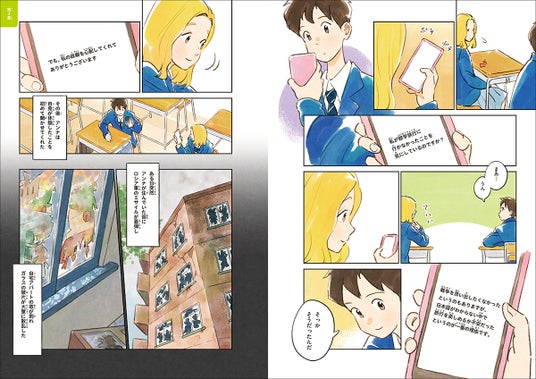 各章の冒頭と巻末に、計40ページの漫画が入っています。ウクライナ避難民の女子中学生と、日本の男子中学生の交流を描いた物語です。主人公の悩みや葛藤に共感し、戦争を自分ごととして考えるきっかけになります。