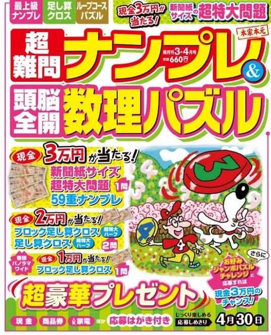 本誌でしか楽しめない新聞サイズの超特大59重ナンプレに、幅57cmの横長ジャンボパズルなど、ハイレベルな問題が満載! 現金3万円ほか、豪華賞品が当たる懸賞も充実!!