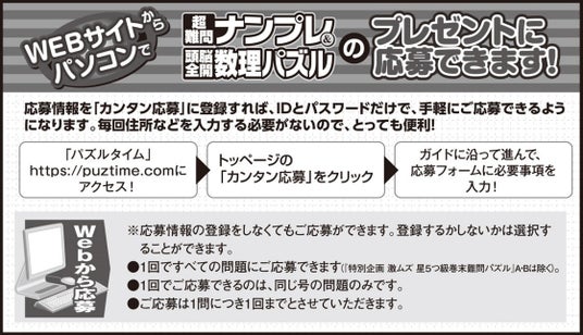 隔月発刊(偶数月2日)。唯一のナンプレ&パズル専門誌として、数理パズルファンも思わずうなる超ハイレベルな問題を毎号たっぷりと収録。幅約75cm・新聞紙サイズの超特大パズルや、現金や金券、家電、ブランド品など豪華賞品が当たる懸賞つきの問題も大好評です。