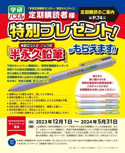 ただいま、学研定期購読センターで『超難問ナンプレ&頭脳全開数理パズル』の新規定期購読を申し込まれた方と、すでに定期購読をされている方全員に、本誌のロゴ入り「ノック式半永久鉛筆」をプレゼントするおトクなキャンペーンを実施中です。