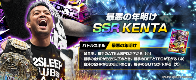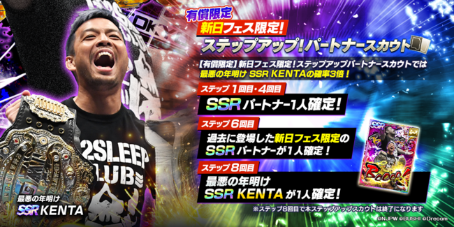 さらに同期間にて、試合中に相手の能力を継続的に下げられる強力なバトルスキルを持ったフェス限定新SSRパートナー「[最悪の年明け]KENTA」が初登場するフェス限定ステップアップパートナースカウトを開催中。