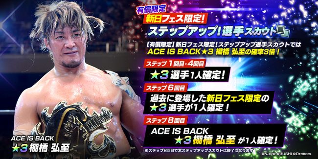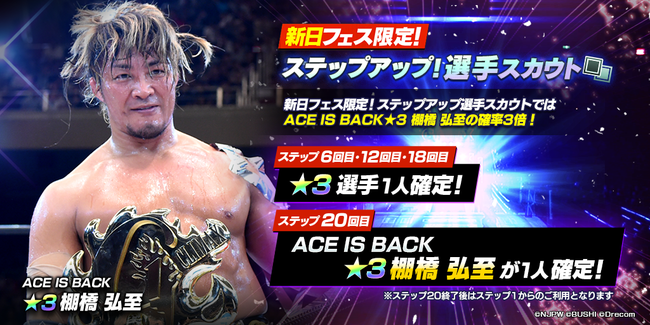 さらに初登場のフェス限定新★3選手「[ACE IS BACK]棚橋弘至」がピックアップ対象選手として、ステップアップ回数に関わらずスカウト確率が通常の3倍かつ獲得時のピース量が増量となっております。