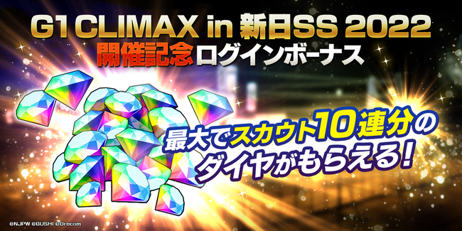 G1 CLIMAX in 新日SS 2022開催記念として、最大1,500ダイヤ(10連スカウト1回分)が獲得できるログインボーナスを実施!