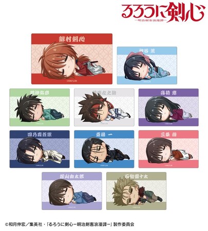 緋村剣心、神谷 薫、明神弥彦、相楽左之助、高荷 恵、四乃森蒼紫、斎藤 一、三条 燕、塚山由太郎、石動雷十太がころんと寝ているちびキャラを新たに描き起こし、カードステッカーに仕上げました。