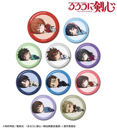 緋村剣心、神谷 薫、明神弥彦、相楽左之助、高荷 恵、四乃森蒼紫、斎藤 一、三条 燕、塚山由太郎、石動雷十太がころんと寝ているちびキャラを新たに描き起こし、缶バッジに仕上げました。