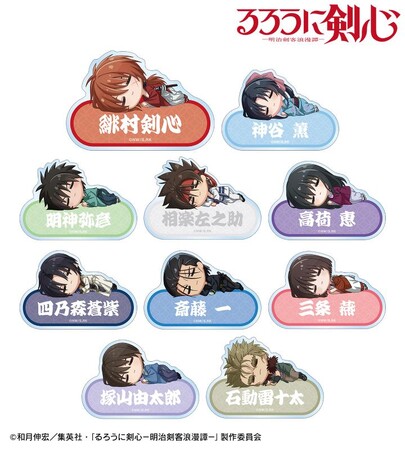 緋村剣心、神谷 薫、明神弥彦、相楽左之助、高荷 恵、四乃森蒼紫、斎藤 一、三条 燕、塚山由太郎、石動雷十太がころんと寝ているちびキャラを新たに描き起こし、アクリルスタンドに仕上げました。