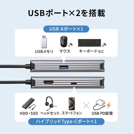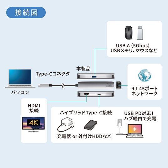Type-Cケーブル1本をパソコンに繋ぐだけで、USB Aポート、Type-Cポート、HDMIポート、LANポートを増設できます。PDポートはデータ転送に対応したハイブリッドType-Cポートです。