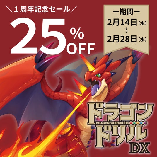 株式会社 学研ホールディングス(東京・品川/代表取締役社長:宮原博昭)のグループ会社、株式会社 Gakken(東京・品川/代表取締役社長:五郎丸徹)は、小学1~4年生向け算数学習アプリ『ドラゴンドリル~さんすうワールド~』iOS/Android版のリリース1周年を記念して、2024年2月14日(水)~2月28日(水)の期間、有料版を全商品25%オフで販売いたします。