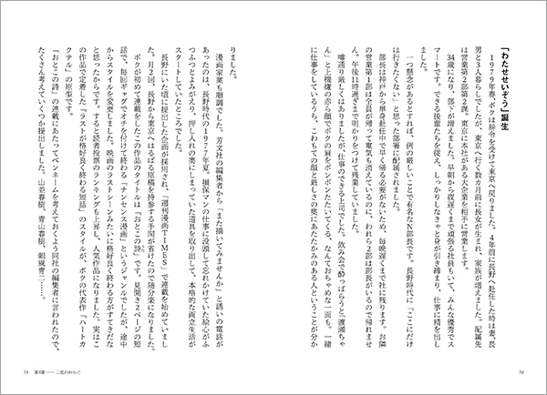 本書は、2023年2月14日から同年4月29日まで「西日本新聞」に連載された回想録「ボクのハートフルライフ」(聞き手:壇知里)に加筆・修正を施し、さらには自選のコミック作品やイラストレーション作品も併録したものです。幼少期の思い出から、絵画に目覚めた頃の逸話、損保会社でのさまざまな経験、そしてもちろん「ハートカクテル」を始めとしたわたせ作品の創作秘話などが明かされ、実際の作品を見ることもできるので、「ことば」と「絵」でわたせワールドを堪能可能となっています。