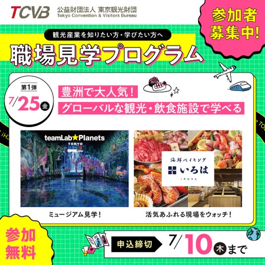 東京都及び(公財)東京観光財団は、観光の仕事のやりがいや魅力を伝えるため、「観光産業の魅力向上応援事業」を実施し、イベントの開催や、職場見学・就業体験等を行います。