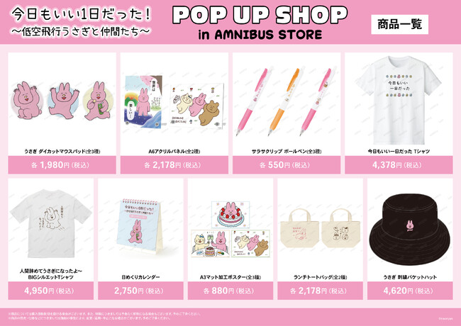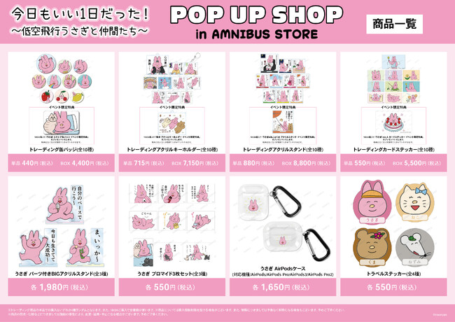 今回のイベントでは、『今日もいい1日だった!~低空飛行うさぎと仲間たち~』より新規グッズを多数先行販売する他、AMNIBUS STORE限定購入特典の配布を予定しております。