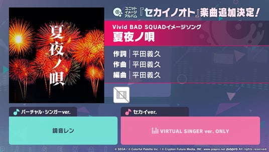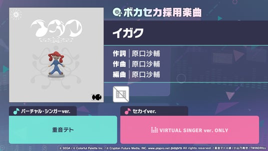新たなリズムゲーム楽曲として、以下6曲の追加が決定いたしました。「イガク」(作詞・作曲:原口沙輔)は、「ボカコレ2024冬TOP100」で1位を獲得した作品、「あちこちデートさん」(作詞・作曲:駄菓子O型)は、「ボカコレ2024冬ルーキーランキング」で1位を獲得した作品、「彗星ノ銀河」(作詞・作曲:マツシタレオ)は、「一緒に作ろう!第22回楽曲コンテストプロセカNEXT」の採用作品、「夏夜ノ唄」(作詞・作曲:平田義久)は、「セカイノオト vol.1」の収録楽曲となります。
