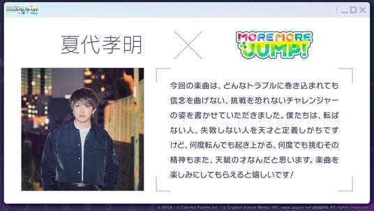 夏代孝明さんには「MORE MORE JUMP !」の書き下ろし楽曲を提供いただきます。