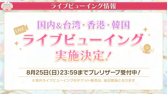 4周年を記念したリアルステージイベント「プロジェクトセカイ 4th Anniversary 感謝祭」のライブビューイングが、日本国内と台湾、香港、韓国で実施することが決定いたしました。また、チケットのプレリザーブを本日から8月25日(日)23:59まで受付中となります。詳細はイベント特設サイト( https://pjsekai.sega.jp/4thanniversarythanksfestival/index.html )、またはイベント公式X( https://x.com/pjsekai_event )よりご確認ください。