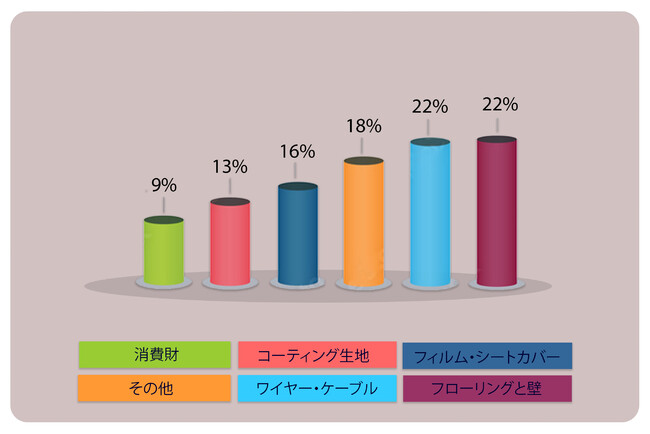 用途に応じて、フローリングと壁、フィルムとシートのカバー、ワイヤーとケーブル、コーティングされた布地、消費財、その他(医療、スポーツ、接着剤とシーラントの用途)に分けられます。