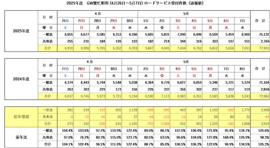 JAF(一般社団法人日本自動車連盟 会長 坂口正芳)は、ゴールデンウィーク期間(4月26日~5月7日まで)のロードサービス受付件数(速報値)をまとめました。