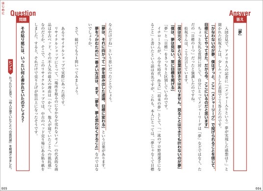 ▲気になる正解は……、「夢」。その心は?? 全部、本書にて解説しています! こんなふうに、突き抜けた一流たちが考えたこと、実行したことなどを、クイズ形式で楽しんで知ることができます。