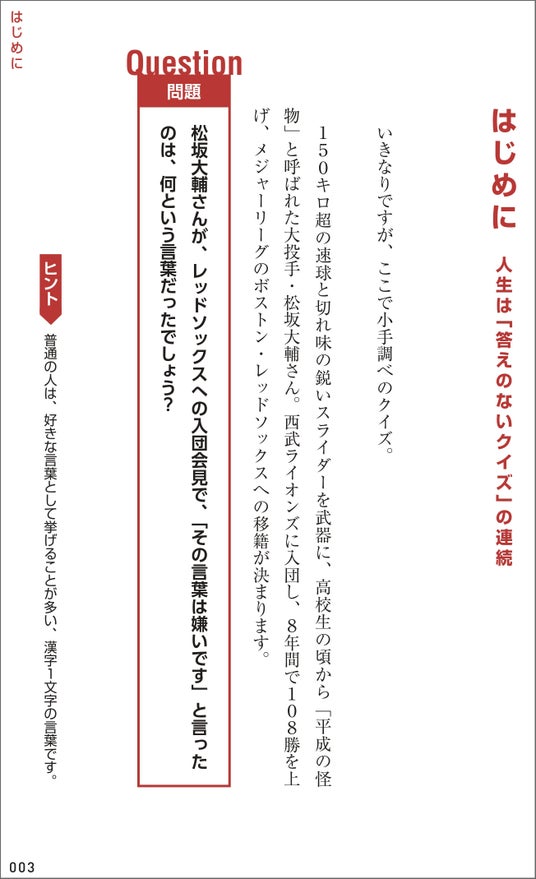 ▲ここでクイズです。「松坂大輔さんが、レッドソックスへの入団会見で、「その言葉は嫌いです」と言ったのは、何という言葉だったでしょう?」