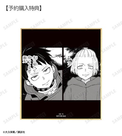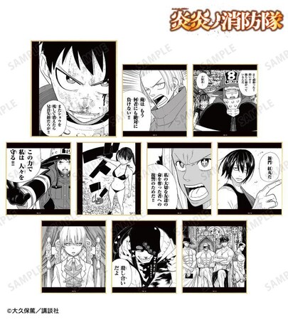 森羅 日下部、アーサー・ボイル、秋樽 桜備、茉希 尾瀬、環 古達、プリンセス火華、新門 紅丸、象 日下部、ジョーカー、レオナルド・バーンズ、カリム・フラム、フォイェン・リィ、烈火 星宮の、原作での印象的なシーンをミニ色紙に仕上げました。