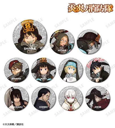 森羅 日下部、アーサー・ボイル、秋樽 桜備、武久 火縄、茉希 尾瀬、環 古達、新門 紅丸、相模屋 紺炉、象 日下部、ジョーカーの、原作での印象的なシーンをスクエア缶バッジに仕上げました。