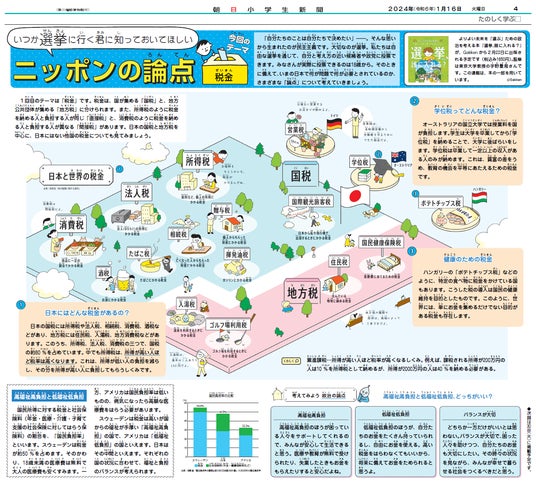 ▲朝日小学生新聞の紙面。連載第1回目のテーマは「税金」。 (C)朝日学生新聞社