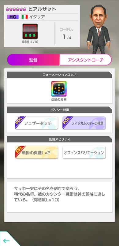 該当の選手を編成すると強くなるフォーメーションコンボ「伝統の昇華」と戦術得意度Lv10を持つ新★6監督「ビアルザット」が登場!