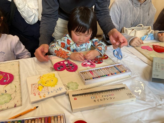 会の後半はハートのフェルトにクレヨンやシールでデコレーションをするワークショップです。直後に控えるバレンタインの贈り物にもぴったりの作品があちこちで完成しました。
