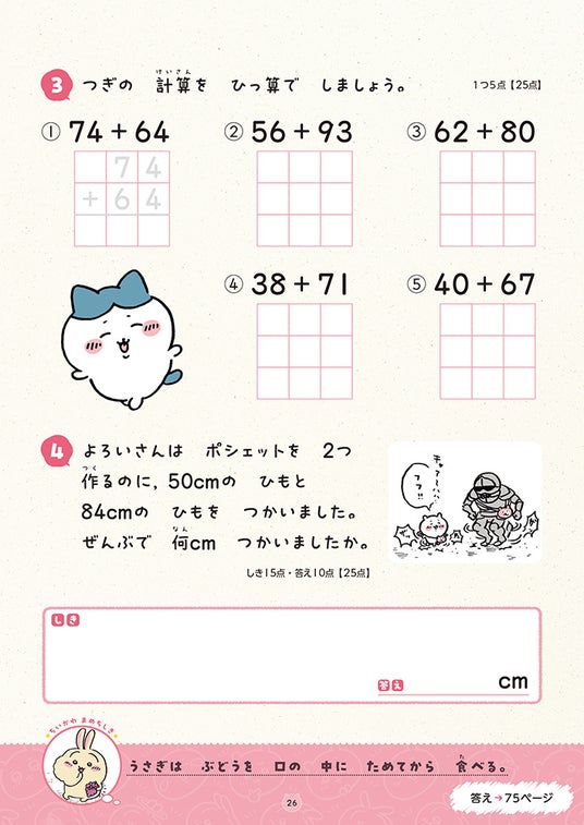 ▲ちいかわのストーリーを踏まえた文章題も面白い! 裏面には「ちいかわまめちしき」つき!