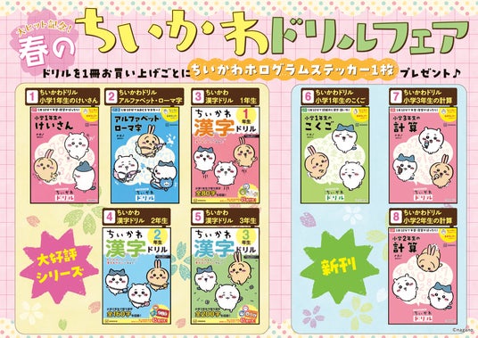 「ちいかわ関連ドリル」の大ヒットを記念して、対象ドリル8冊のうち、いずれか1冊買うごとに限定ホログラムステッカー1枚をプレゼントするキャンペーンを実施することになりました。