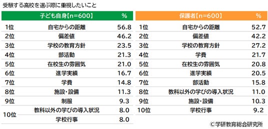 子ども自身が受験する高校を選ぶ際に重視したいことをきいたところ、1位「自宅からの距離」(56.8%)、2位「偏差値」(46.2%)、3位「学校の教育方針」(23.5%)、4位「部活動」(21.3%)、5位「在校生の雰囲気」(21.0%)となりました。