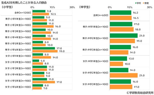 ●ChatGPTなど対話型生成AIの利用経験 ▶「学校で利用したことがある」小学生の10%、中学生の16% ▶「家庭で利用したことがある」小学生の13%、中学生の17%