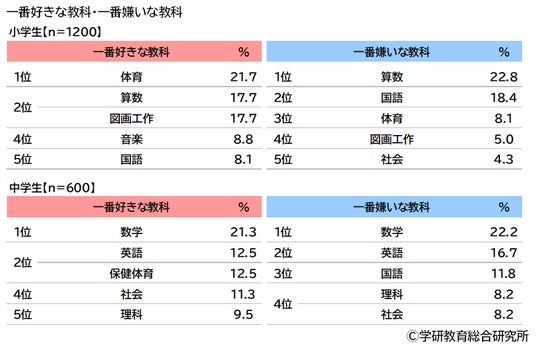 また、中学生では一番好きな教科は1位「数学」(21.3%)、2位「英語」「保健体育」(いずれも12.5%)、4位「社会」(11.3%)、5位「理科」(9.5%)、一番嫌いな教科は1位「数学」(22.2%)、2位「英語」(16.7%)、3位「国語」(11.8%)、4位「理科」「社会」(いずれも8.2%)となりました。