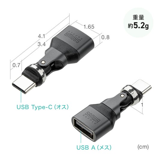 本体サイズは約W1.65×D4.1×H1cm、重さは約5.2gとコンパクト。持ち運びしやすく、バッグやポーチに入れてもかさばりません。さらに、暗い場所でも通電状態を確認できるLEDを搭載し、ピン部分には錆に強く信号劣化が少ない金メッキを採用。USB 2.0対応で日常使いしやすく、細部まで実用性にこだわった設計です。