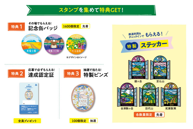 特別キャンペーンとして、東武鉄道の「尾瀬夜行」もしくは東武特急「リバティ会津」を利用してスタンプを獲得した方には、通常の特典に加えてステンドグラス風デザインの「特製ステッカー」をプレゼントします。チェックインポイントや特典の詳細は、下記をご確認ください。