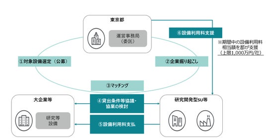 本事業では、大企業等が保有する研究開発設備等をスタートアップや中小企業に貸し出すことを通じ、新たな事業開発や協業の検討を促すことで、双方の研究開発活動の効率化や共創事例の創出を目指します。