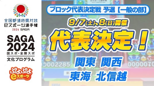 株式会社セガは、ジャパン・eスポーツ・プロライセンス認定タイトルである、対戦アクションパズルゲーム「ぷよぷよ」シリーズについて、2024年9月7日(土)、9月8日(日)に「全国都道府県対抗eスポーツ選手権 2024 SAGA ぷよぷよ部門 一般の部」の「ブロック代表決定戦 予選」を開催し、関東、関西、東海、北信越の「ブロック代表決定戦 決勝」へ進出する代表選手が決定いたしました。