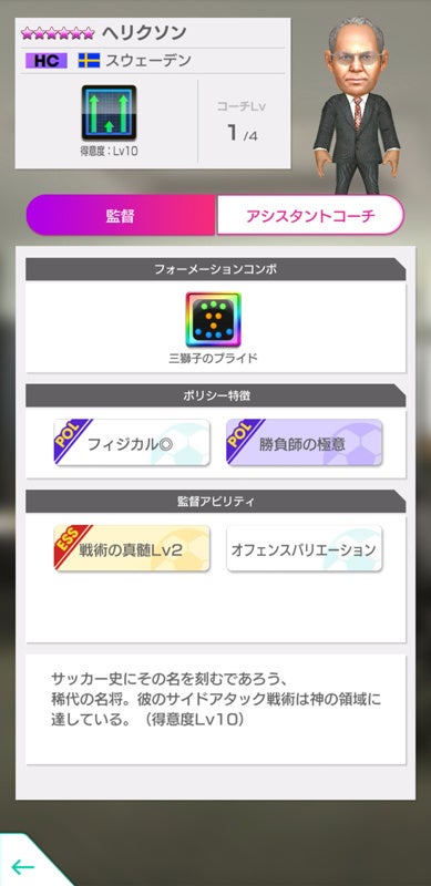 該当の選手を編成すると強くなるフォーメーションコンボ「三獅子のプライド」と戦術得意度Lv10を持つ新★6監督「ヘリクソン」が登場!
